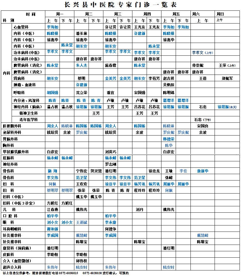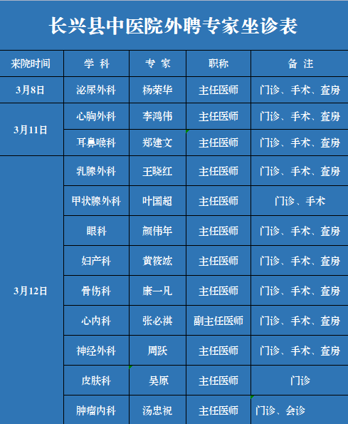 长兴县中医院专家坐诊信息来啦