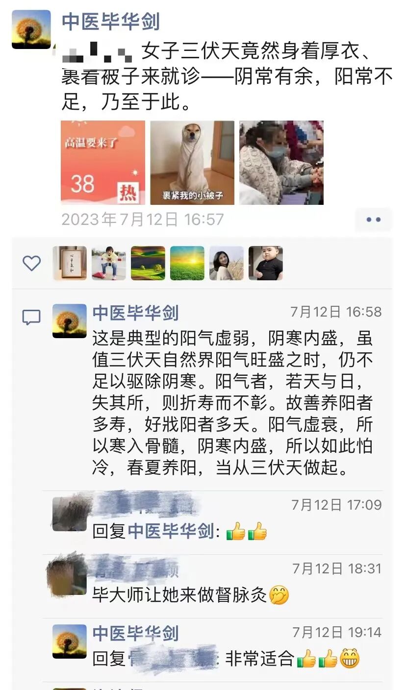 “阳虚则营养温煦功能失调,因此往往存在手脚冰凉,畏寒肢冷,脉沉细而无力,进食生冷寒凉之物后如堕冰窟,大便稀溏等症状。”长兴县中医院主治中医师毕华剑介绍,冰冻三尺非一日之寒,针对营血虚弱,寒凝经脉,血行不利之症,需服用温经散寒,养血通脉类中药进行调理,同时抓住三伏天的养生时机,配合督脉灸、三伏贴等中医适宜技术疗法。