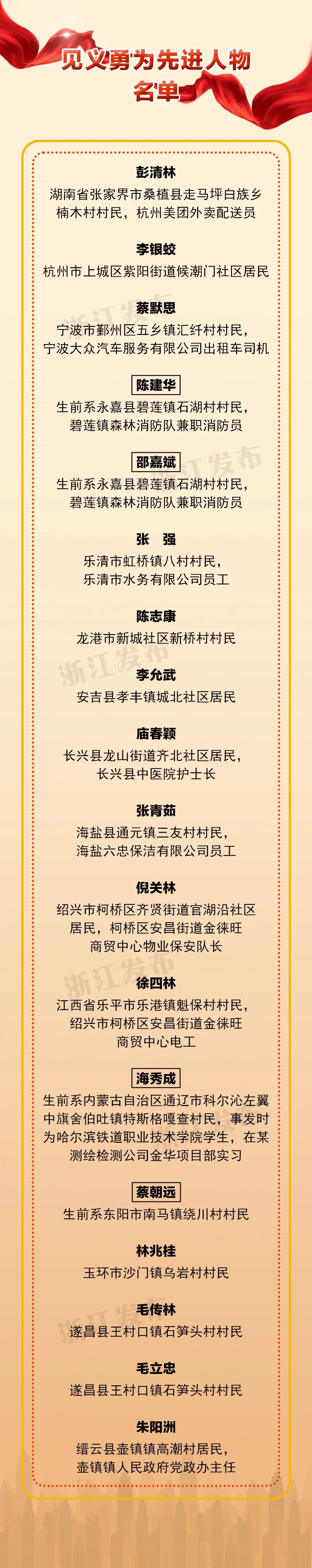 为大力弘扬社会正气,倡导见义勇为行为,激励广大人民群众与违法犯罪行为作斗争,积极参与抢险救灾,日前,浙江省政府印发《关于给予彭清林等18位见义勇为先进人物记功奖励的决定》,决定为彭清林、李银蛟、蔡默思、张强、陈志康、李允武、庙春颖、张青茹、倪关林、徐四林、林兆桂、毛传林、毛立忠、朱阳洲记一等功,为陈建华、邵嘉斌、海秀成、蔡朝远追记一等功。