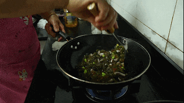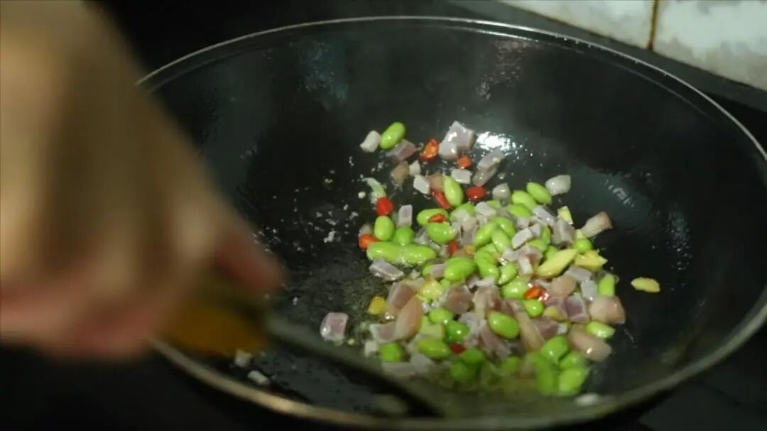 起锅、烧油,咸肉末、青豆、小米辣、生姜在锅中热烈碰撞,随着温度慢慢升高,诱人的香气弥散开来。